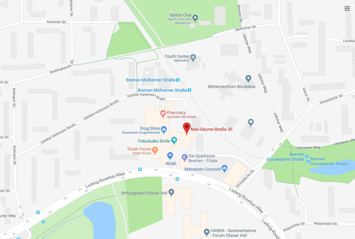 Wir befinden uns im Einkaufszentrum Blockdiek (gegenüber der Post). Direkt vor unserer Praxis hält die Buslinie 25, Haltestelle "Einkaufszentrum Blockdiek". Hinter dem Einkaufszentrum hält die Straßenbahnlinie 1, “Haltestelle Mühlheimer Straße“.